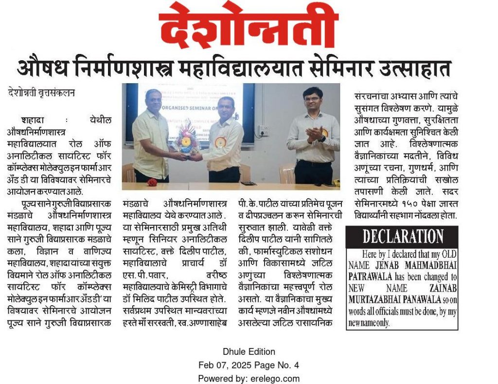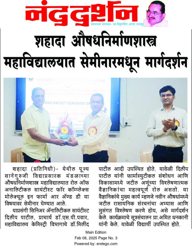 PSGVPM COP & PSGVPM ASC Shahada Jointly Organized Seminar on “Role of Analytical Scientist for Complex Molecule in Pharma R & D 2024 - 25